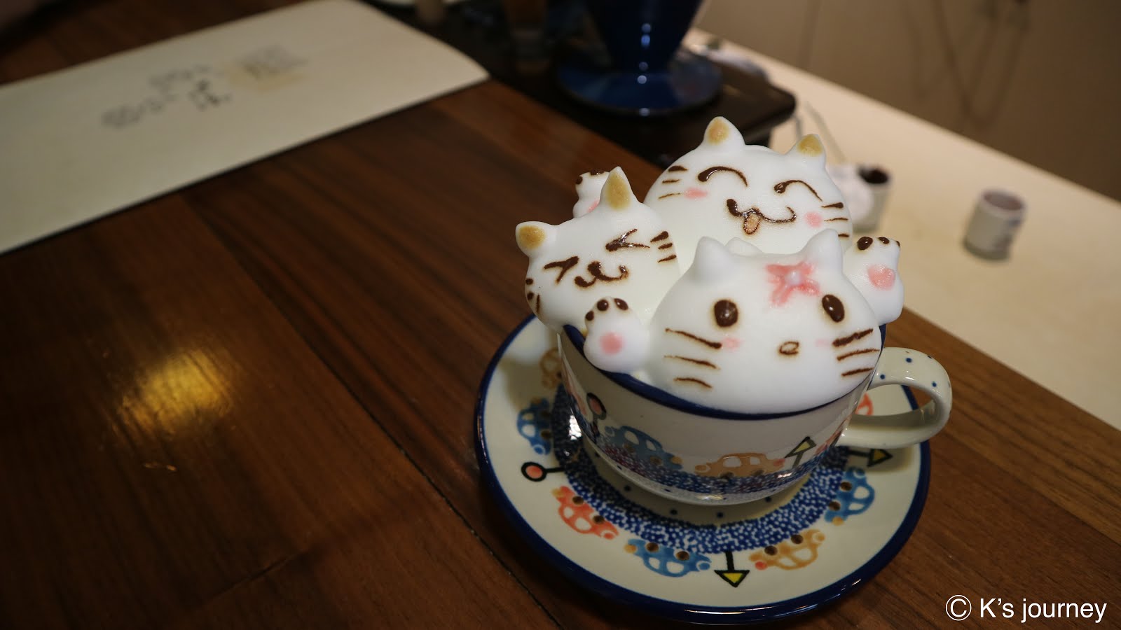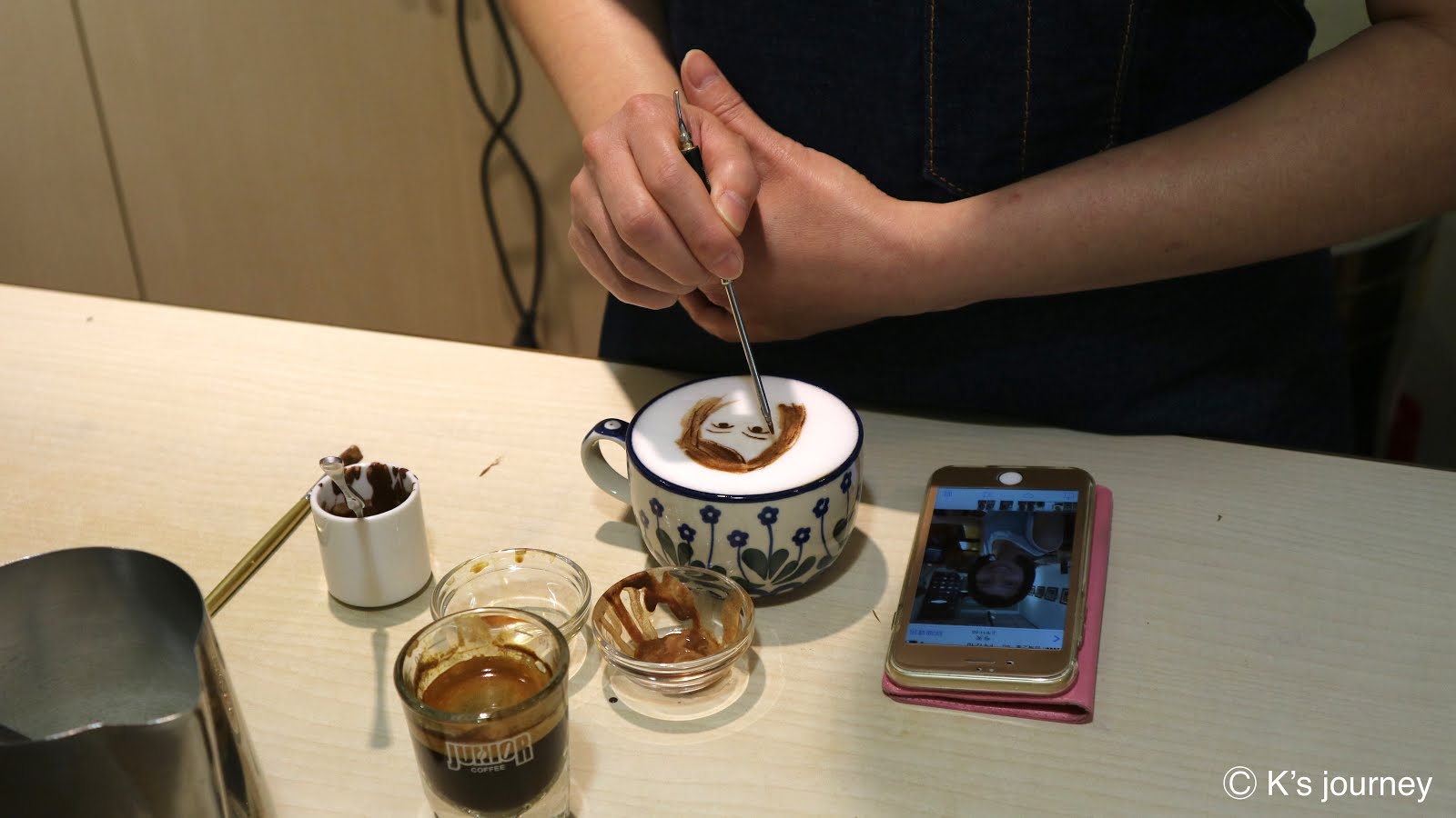 採訪當天,挑戰了桂芳姊自認最不拿手的人像畫,對於臉部陰影的掌握,她謙虛地說還有進步空間。五分鐘不到,全世界獨一無二的KK限定拉花拿鐵誕生啦!