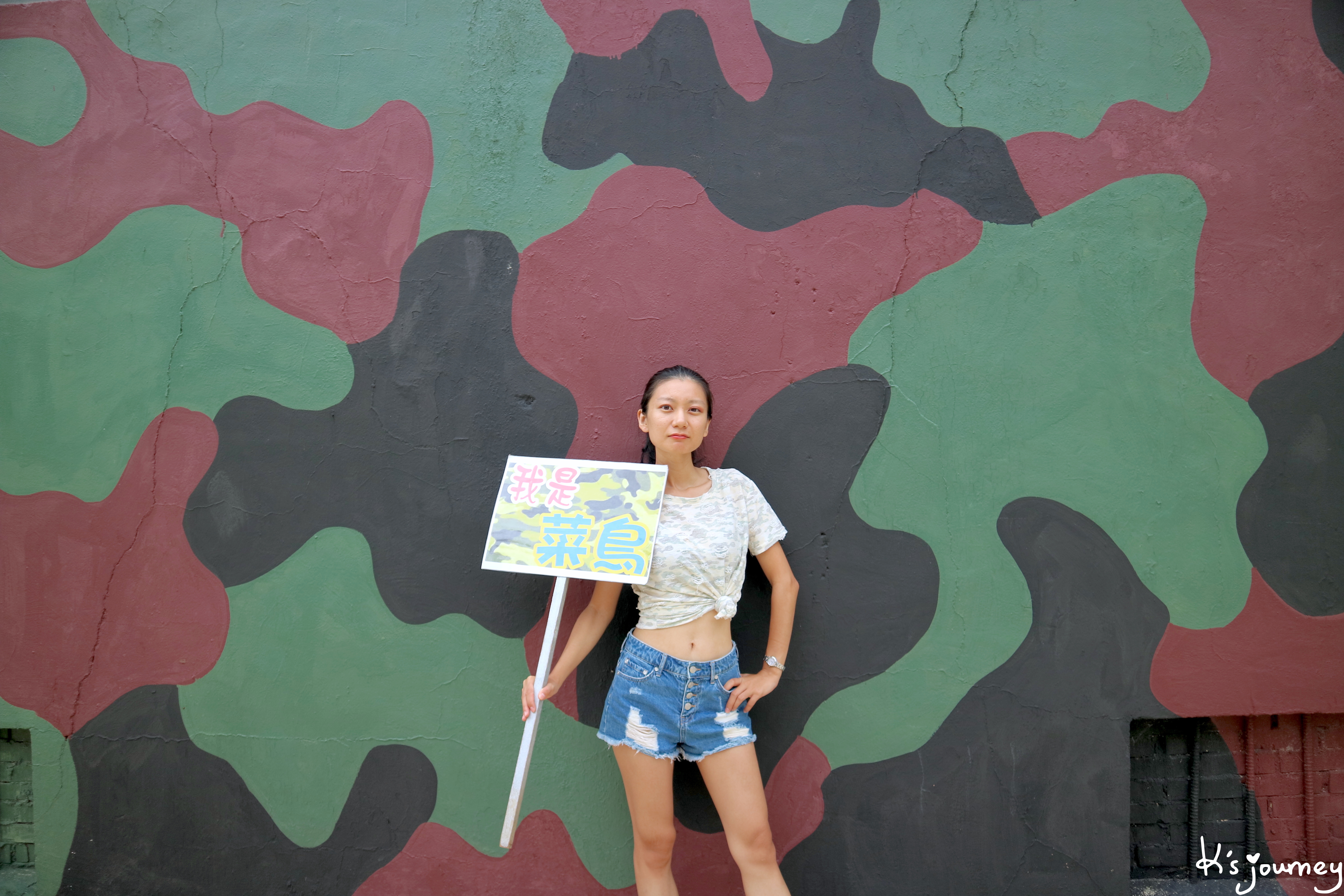后麟營區過去為軍方的補給連,現在成為全國第一座步槍模擬射擊館,有服務中心、更衣室、射擊體驗館、停車場、公廁等空間。於櫃檯報到領識別證後,便可到一旁的更衣室換裝。穿上一整套迷彩服的我儼然就是個菜鳥天兵,但不得不說阿兵哥真辛苦,夏天穿這套很熱耶!另外,服務中心還提供手牌供遊客拍照,大家可以選擇適合的字句,其中「天兵」和「菜鳥」最符合我的狀態。瞧!我的天兵表情是不是很到位?