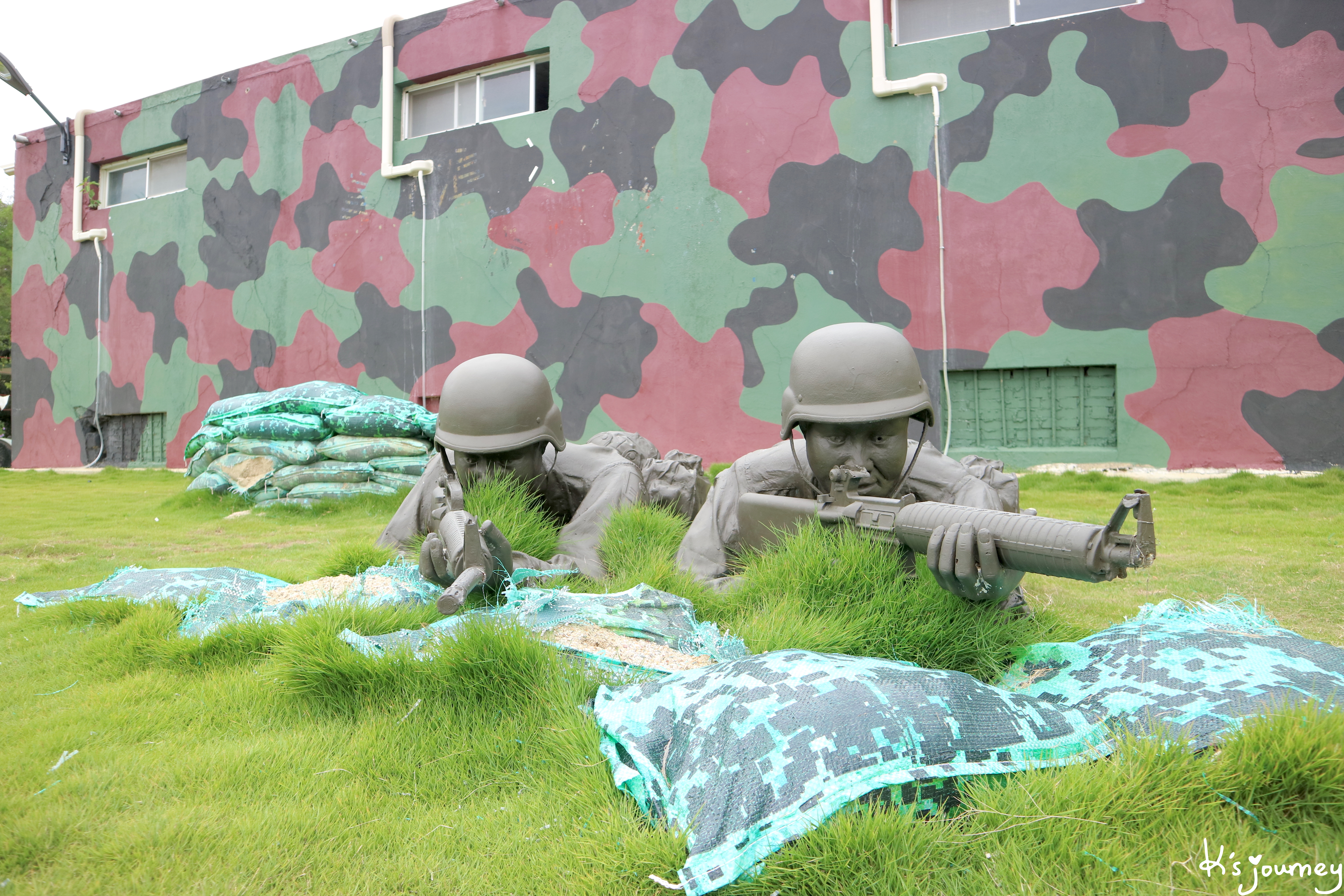 體驗完射擊趕緊到園區外拍照吧!這裡的迷彩牆好適合拍IG照呀!另外也有一些軍事裝置和假軍人,若三五好友一起來拍些互動照片肯定更好玩!還可以上演「請鄰兵以火力掩護我」的橋段!
