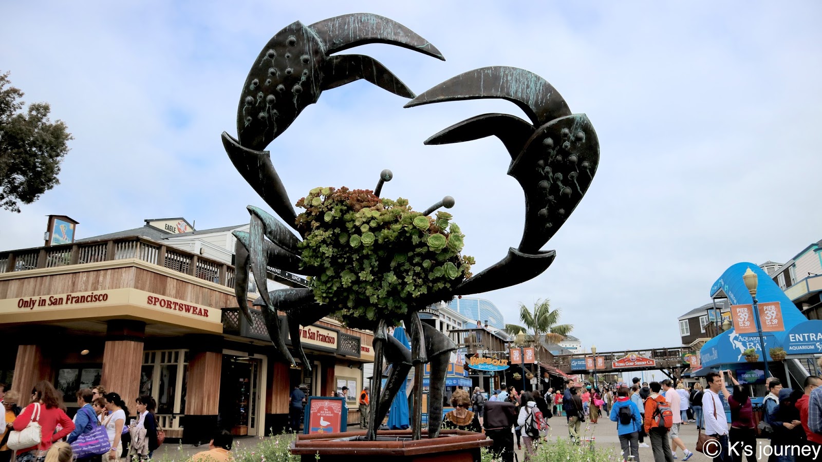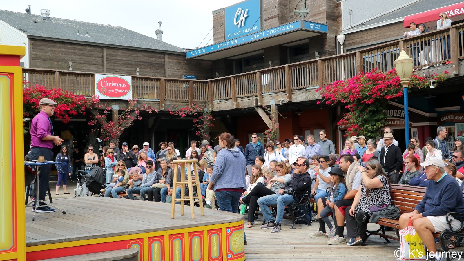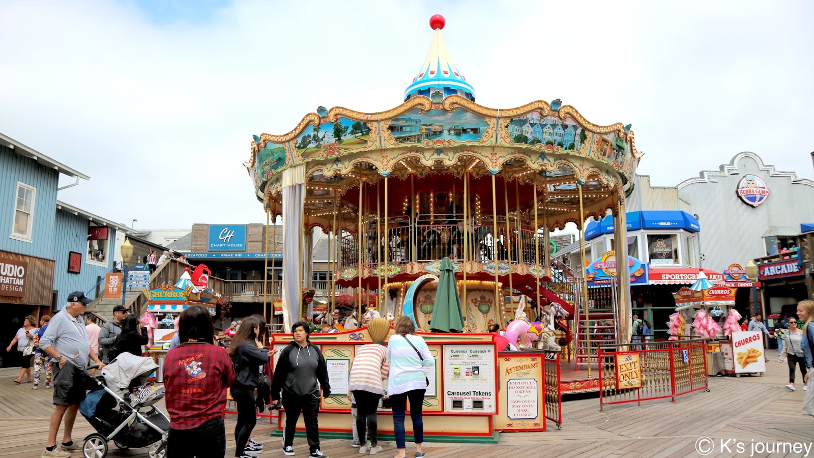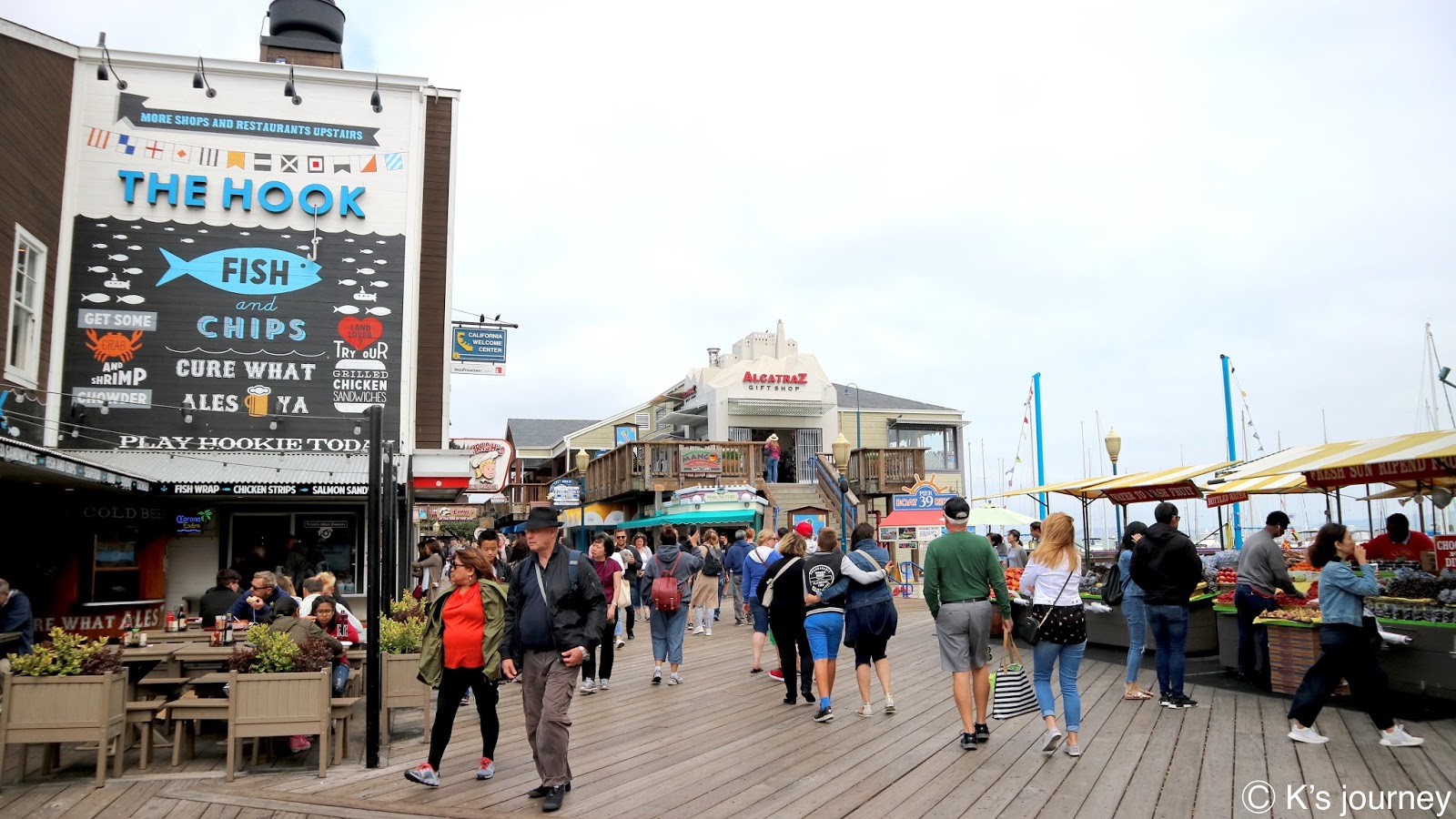 終點站可到漁人碼頭(Fisherman’s Wharf)。廣場有很多餐廳,紀念品店逛不完,每間店招牌和建築風格繽紛可愛,還有旋轉木馬和魔術表演,和台灣各縣市漁人碼頭很不一樣,這裡根本小樂園來著,超熱鬧的!走到岸邊還可眺望著名地標惡魔島和金門大橋。