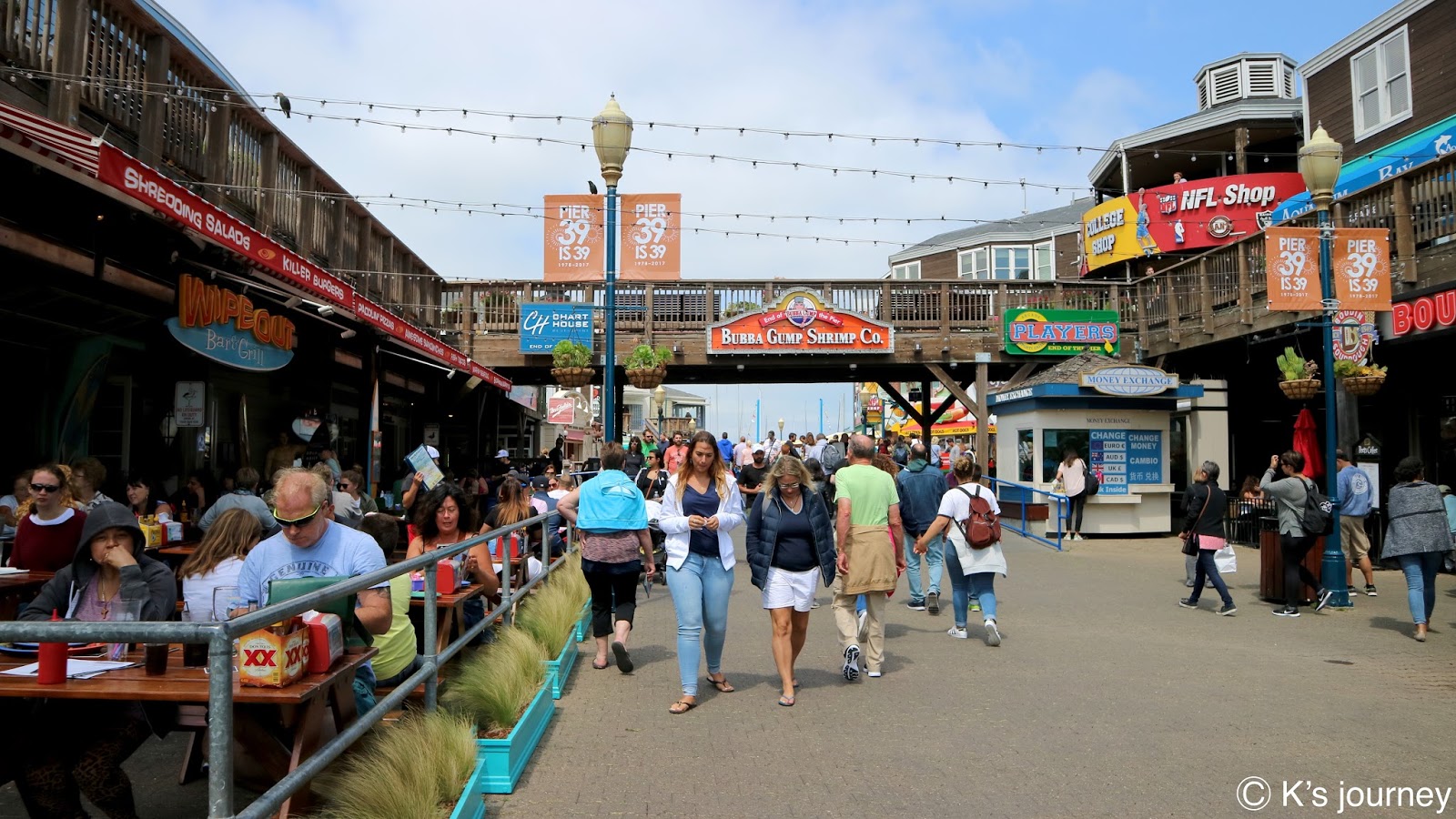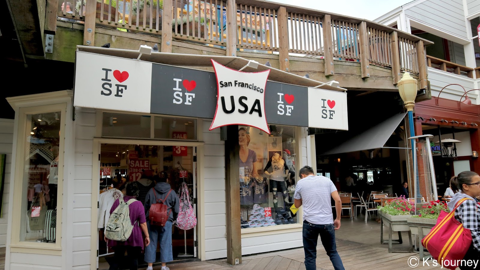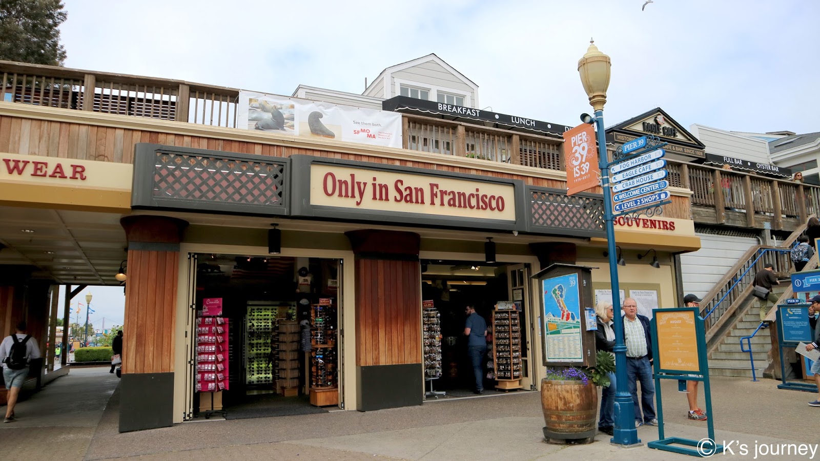 終點站可到漁人碼頭(Fisherman’s Wharf)。廣場有很多餐廳,紀念品店逛不完,每間店招牌和建築風格繽紛可愛,還有旋轉木馬和魔術表演,和台灣各縣市漁人碼頭很不一樣,這裡根本小樂園來著,超熱鬧的!走到岸邊還可眺望著名地標惡魔島和金門大橋。