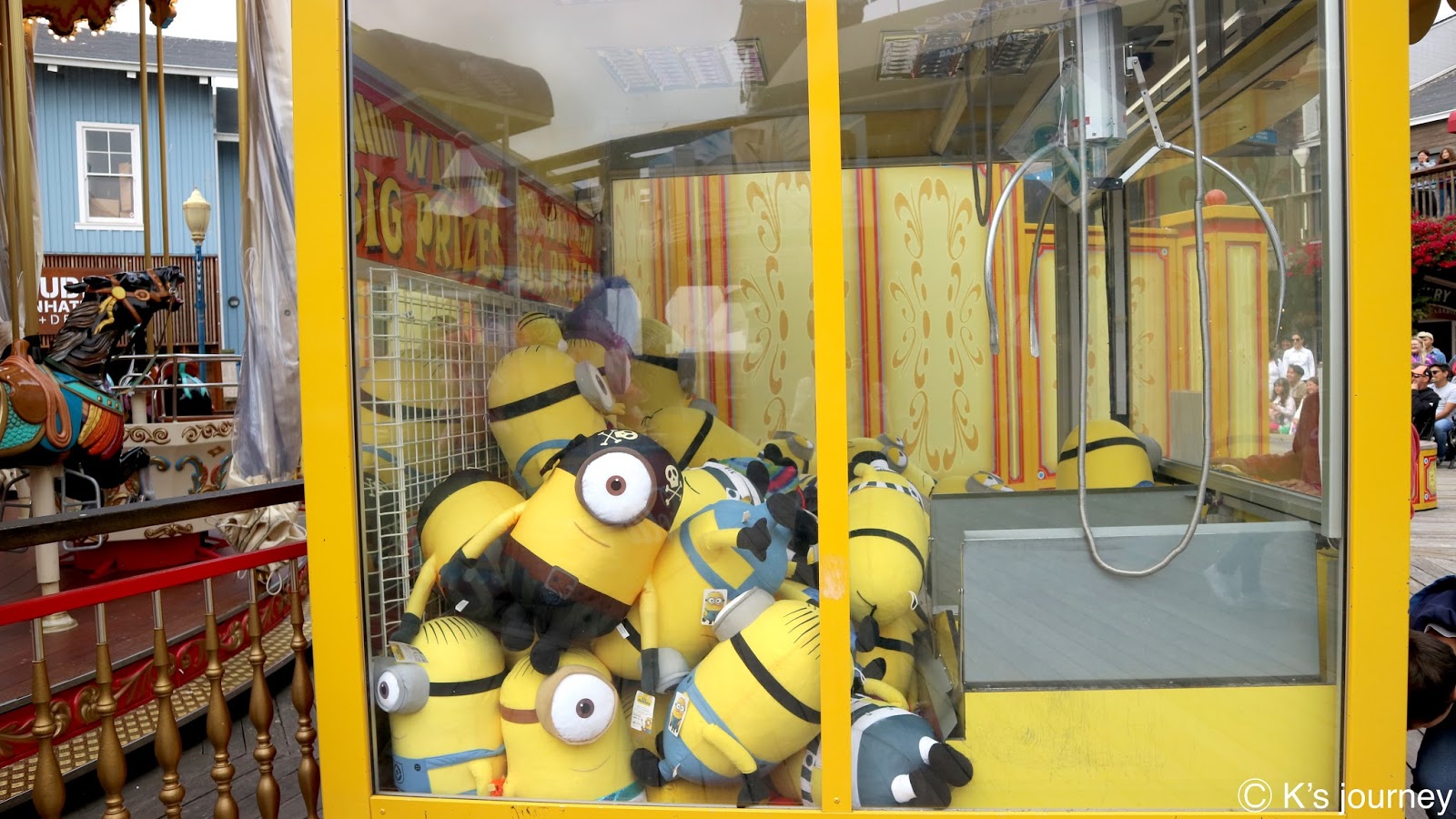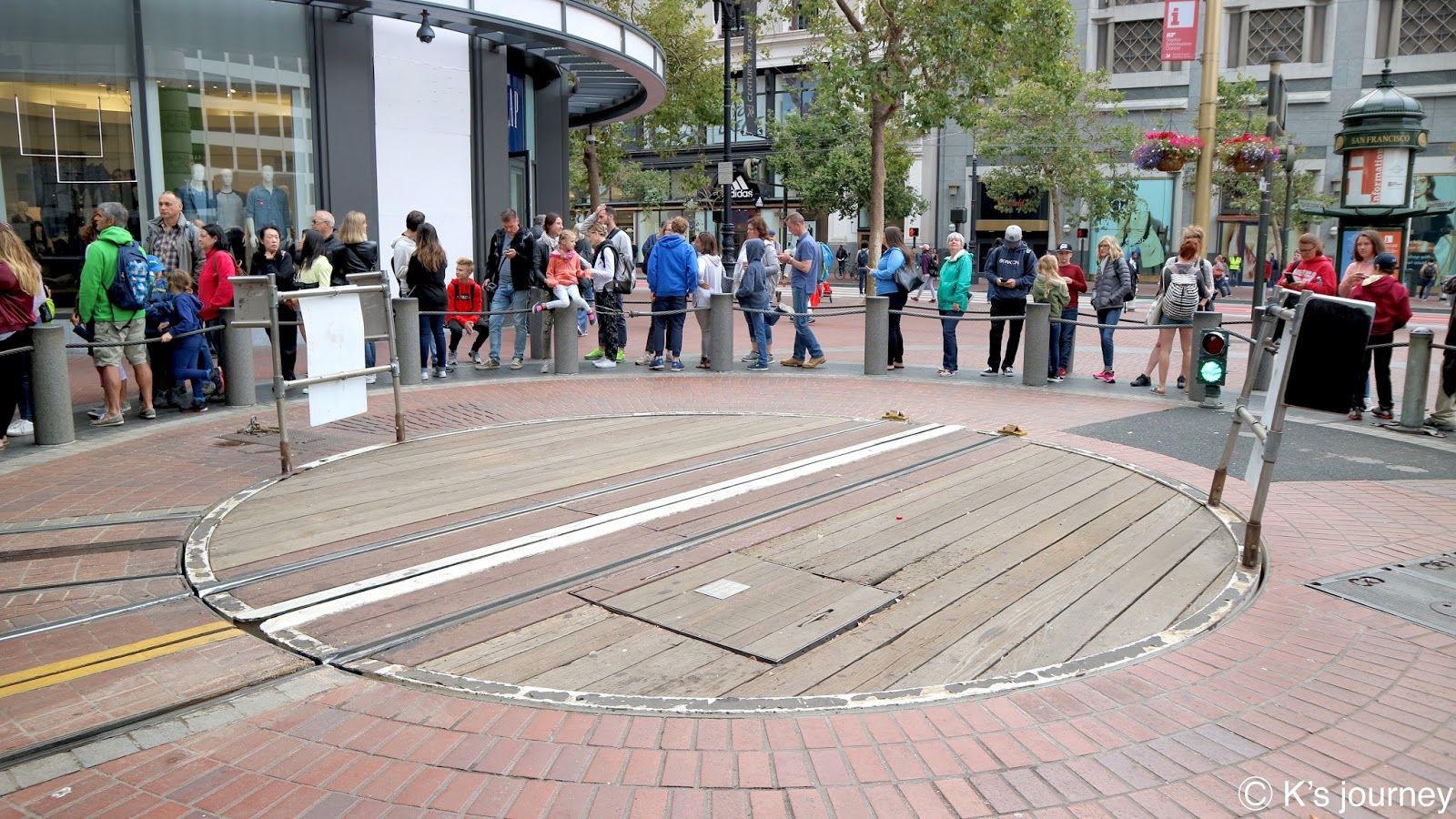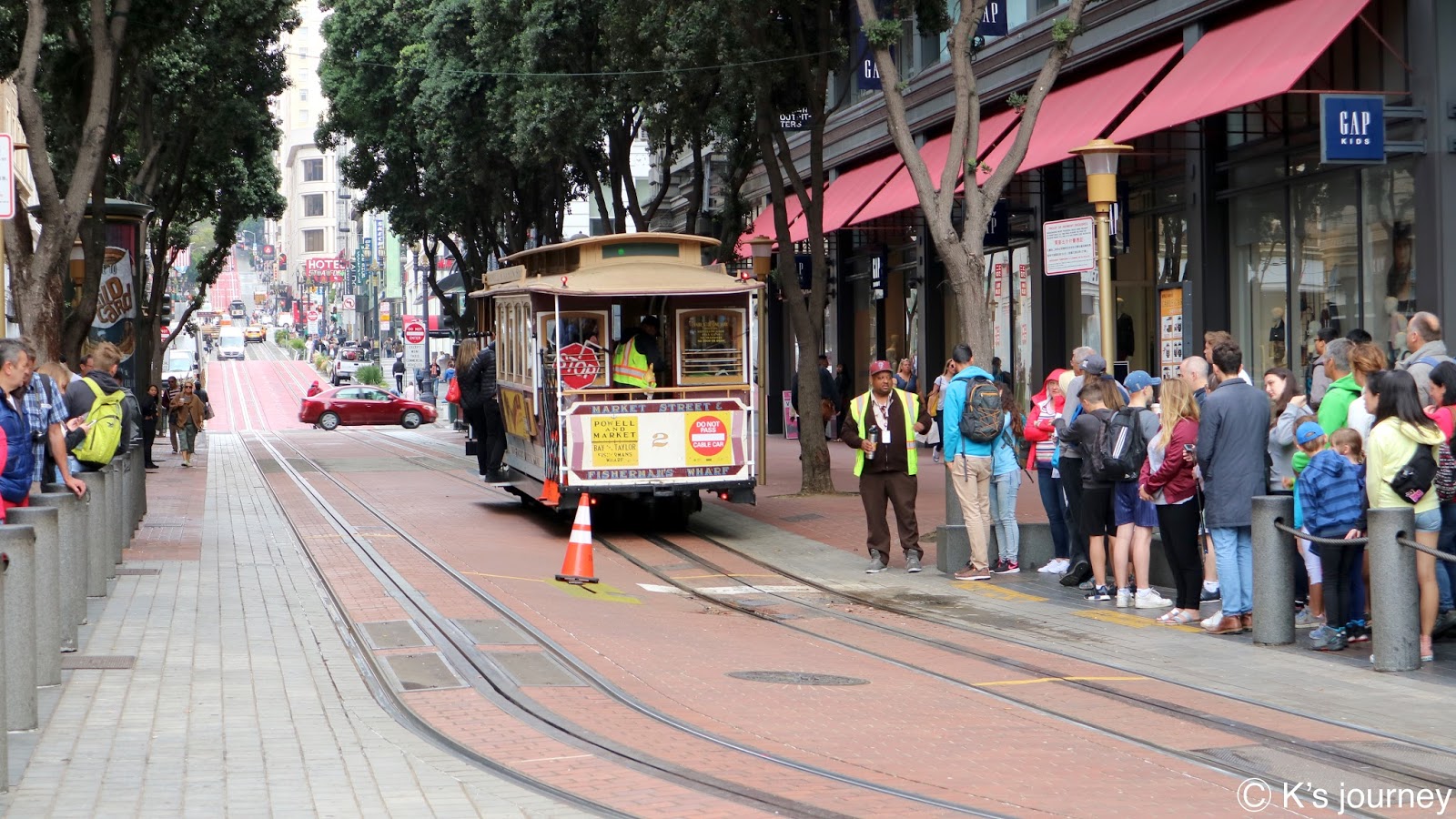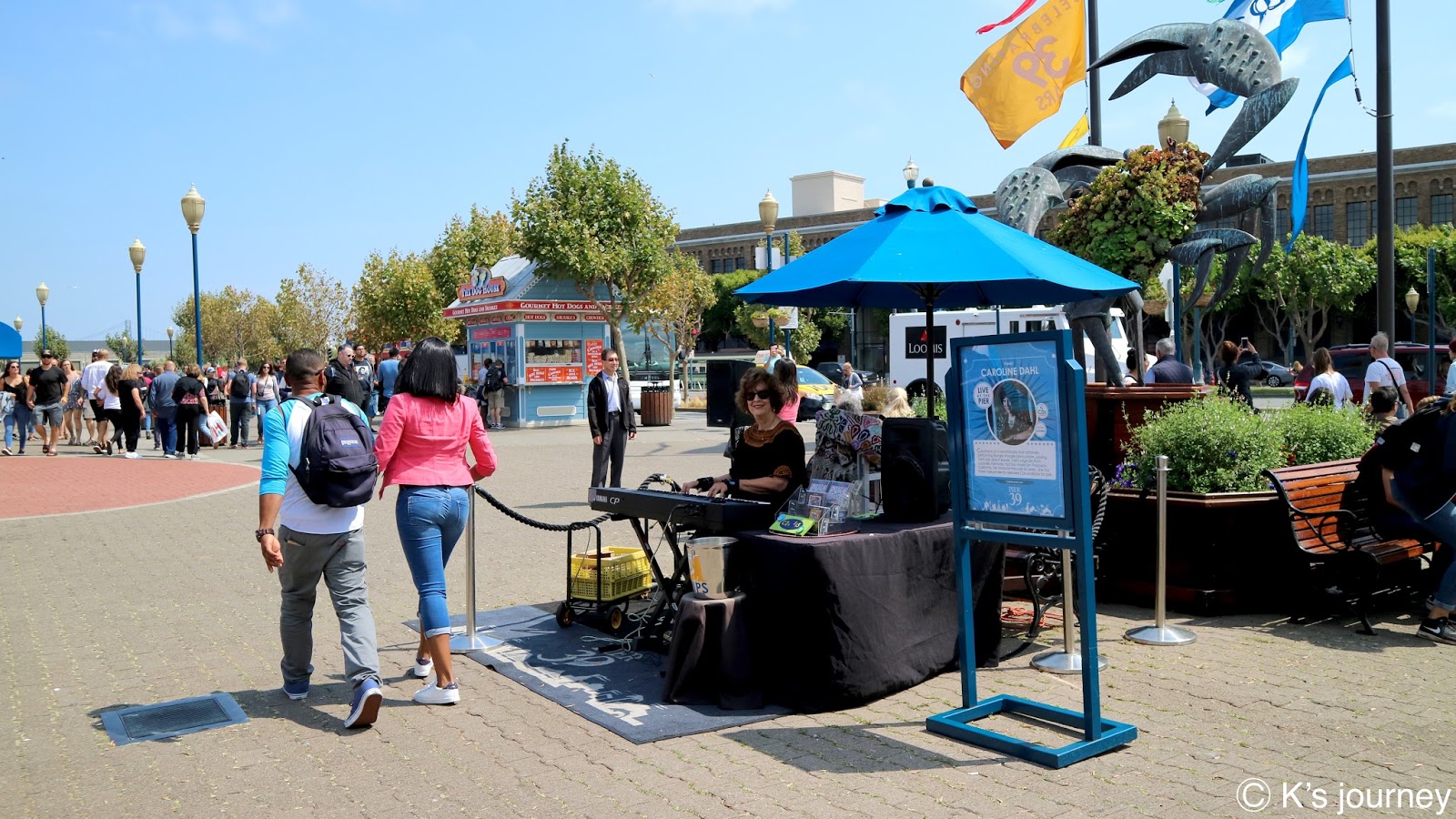 終點站可到漁人碼頭(Fisherman’s Wharf)。廣場有很多餐廳,紀念品店逛不完,每間店招牌和建築風格繽紛可愛,還有旋轉木馬和魔術表演,和台灣各縣市漁人碼頭很不一樣,這裡根本小樂園來著,超熱鬧的!走到岸邊還可眺望著名地標惡魔島和金門大橋。