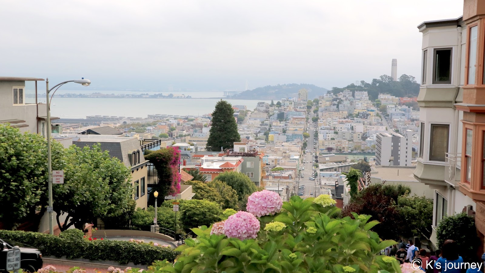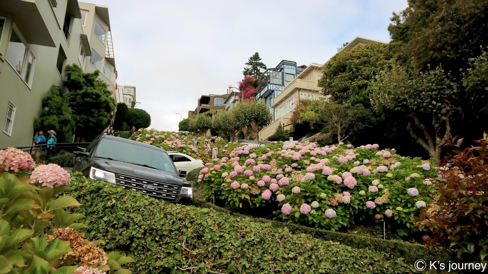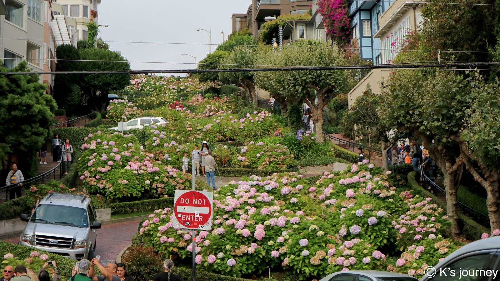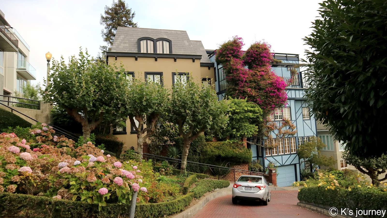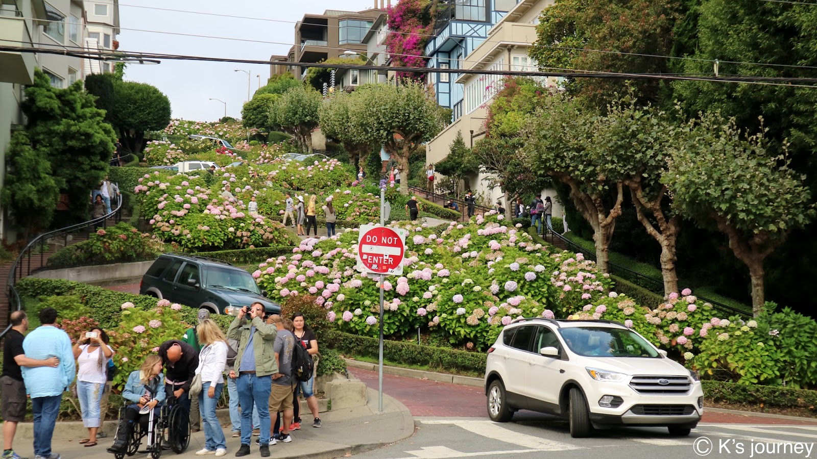 由於旅行社的遊覽車到不了這裡,所以安排讓我們體驗叮噹車。九曲花街是全世界最彎曲的車道,坡度為40度,超抖!當初是為了行車安全特地透過增建花圃的方式,設計8個Z字型彎道,以降低車速並只能單行。來這裡駕駛技術要很好,我在一旁看都快嚇死了。