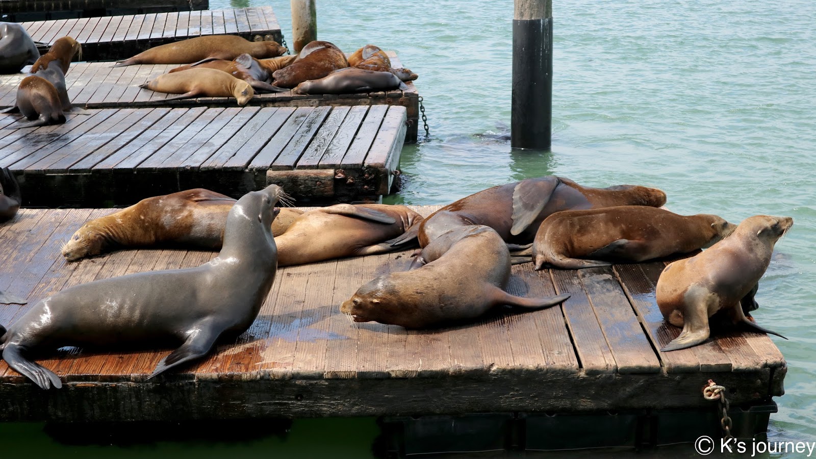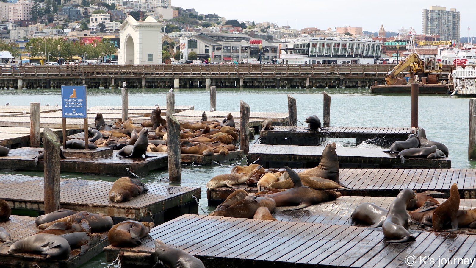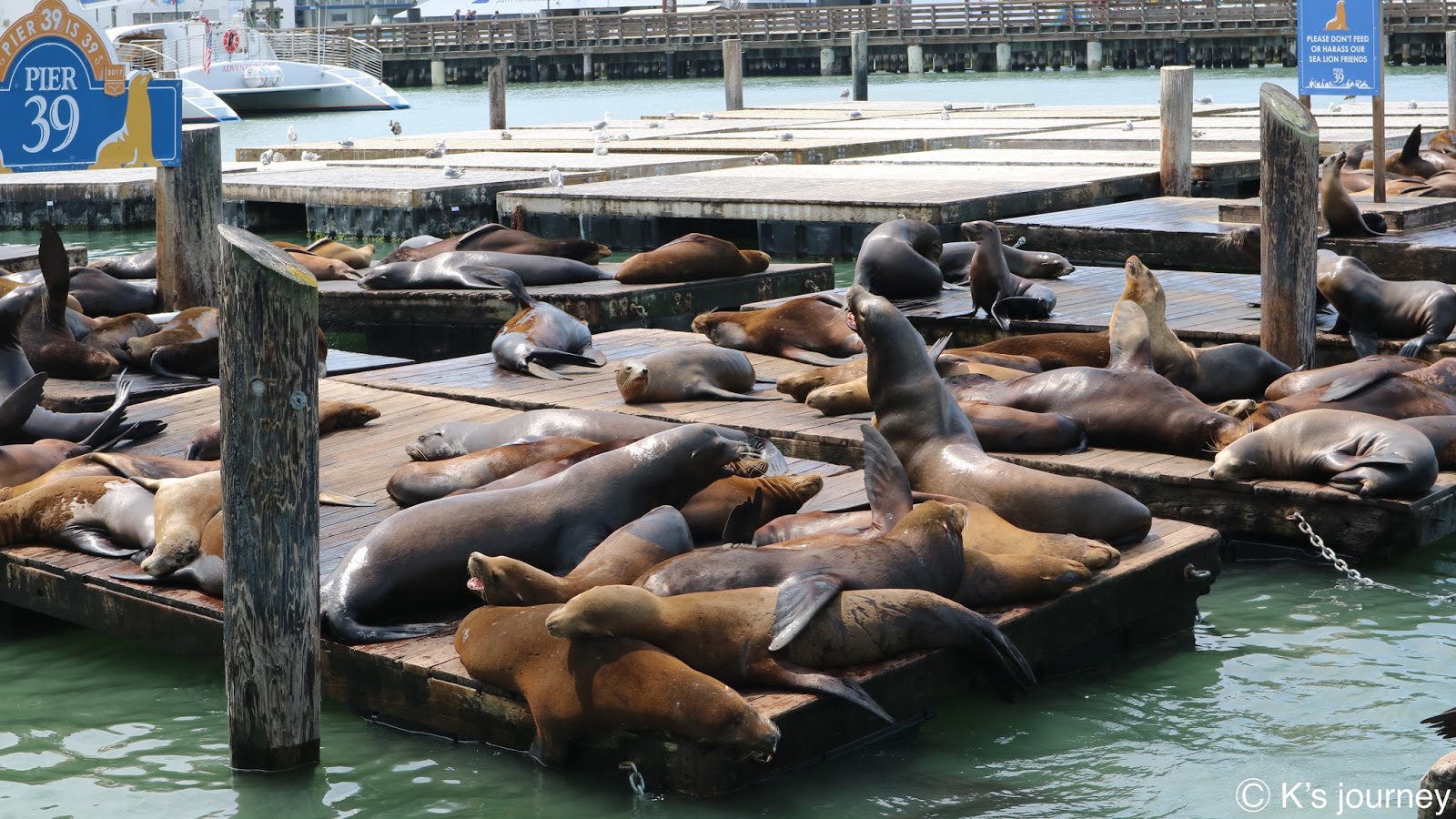 老實說KK這次參加City Tour當地旅遊團,快閃舊金山市區一天,沒很認真做功課。我是逛漁人碼頭逛到一半突然聽到叫聲,才知道已經走到39號碼頭(Pier 39),這裡有療癒可愛的海獅群!!!人生第一次看到海獅!我在這邊待超過20分鐘,最後來不及吃飯就被導遊催上車了XDD