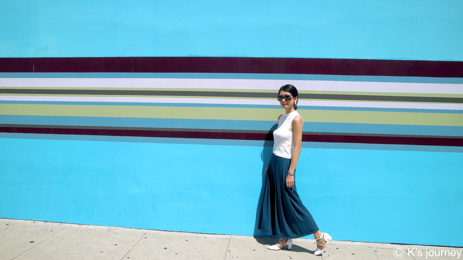 雖然我是Made in Taiwan,但雙腳既然都已經踩在洛杉磯了,就來當一天假Local吧!這個點也算是網美必拍,家具店Cisco Home Melrose的外牆。藍色條紋牆