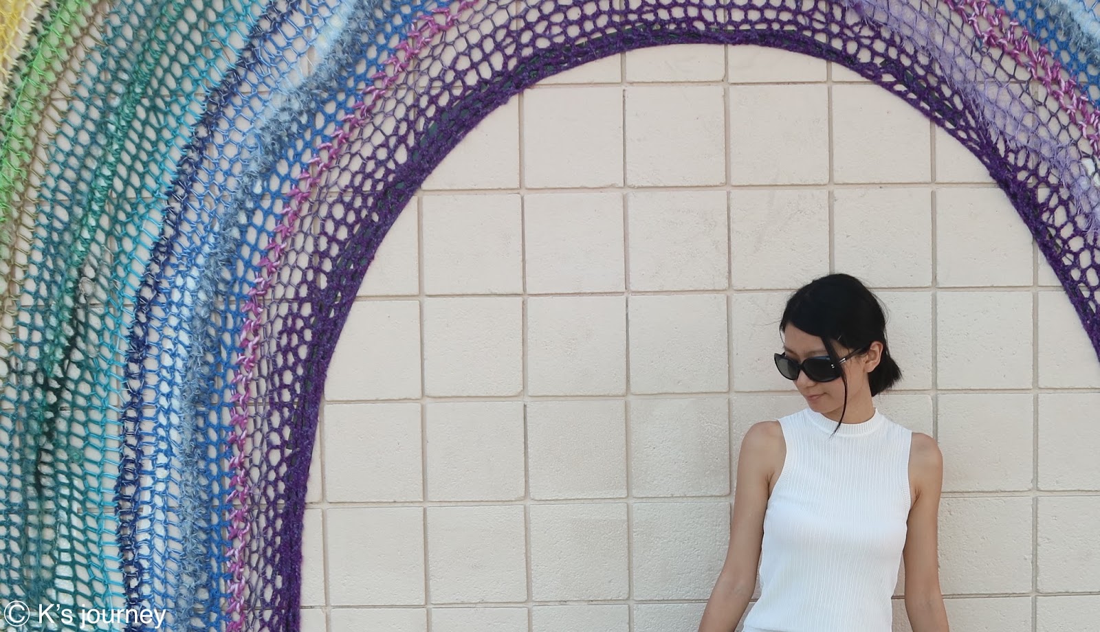 Made in LA對面有藍色條紋牆,顏色飽和,很像在拍時尚雜誌!旁邊是彩虹編織,和其他彩繪牆不同,這是藝術家London Katy用毛線編織出來的!