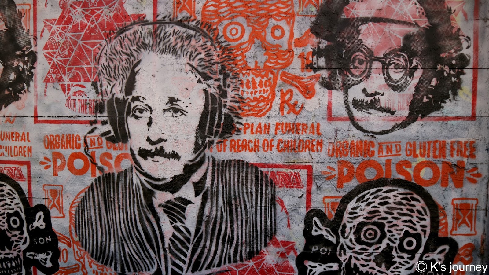 韓裔美國人David Choe的創作,就在East 7th St & Mateo St交叉口。真的很佩服藝術家天馬行空的想像力,利用線條、幾何圖形、色塊堆疊出優秀作品。死神