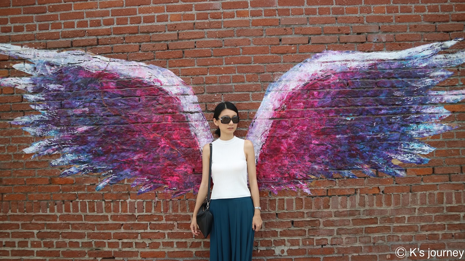 誤打誤撞發現Kobe,就算不是籃球迷看了也會很興奮!這是藝術家JC RO的作品,擅用不同深淺色塊讓圖像更顯層次。這是一家球鞋店Shoe Palace的外牆,在洛杉磯其他分店也有JC RO的作品。身為籃球迷的你快去蒐集吧!KOBE牆對面的壁畫也很有趣,與各位分享。Angel Wings(天使翅膀)