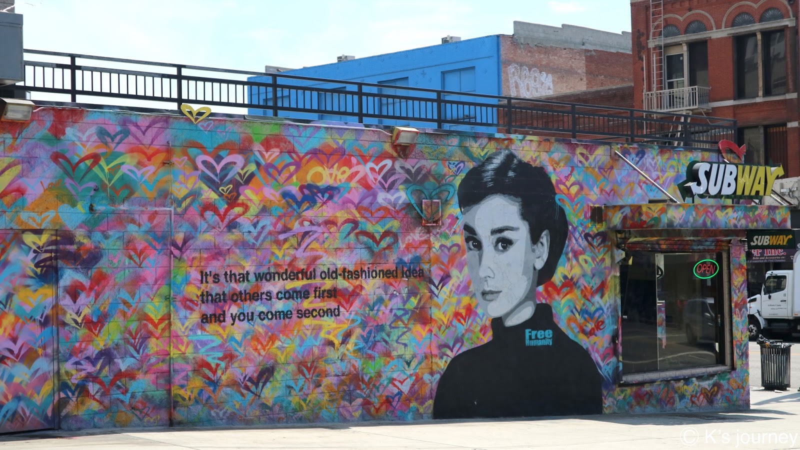 等紅燈時發現Subway外牆的奧黛麗赫本,立馬下車奔到對面。上面還寫了一句奧黛麗赫本的名言:“It’s that wonderful old-fashioned idea that others come first and you come second.”背景是多彩愛心堆疊,看上去亂亂的卻有一種協調美。在市中心附近也都有藝術家Free Humanity的作品。Willow Studios