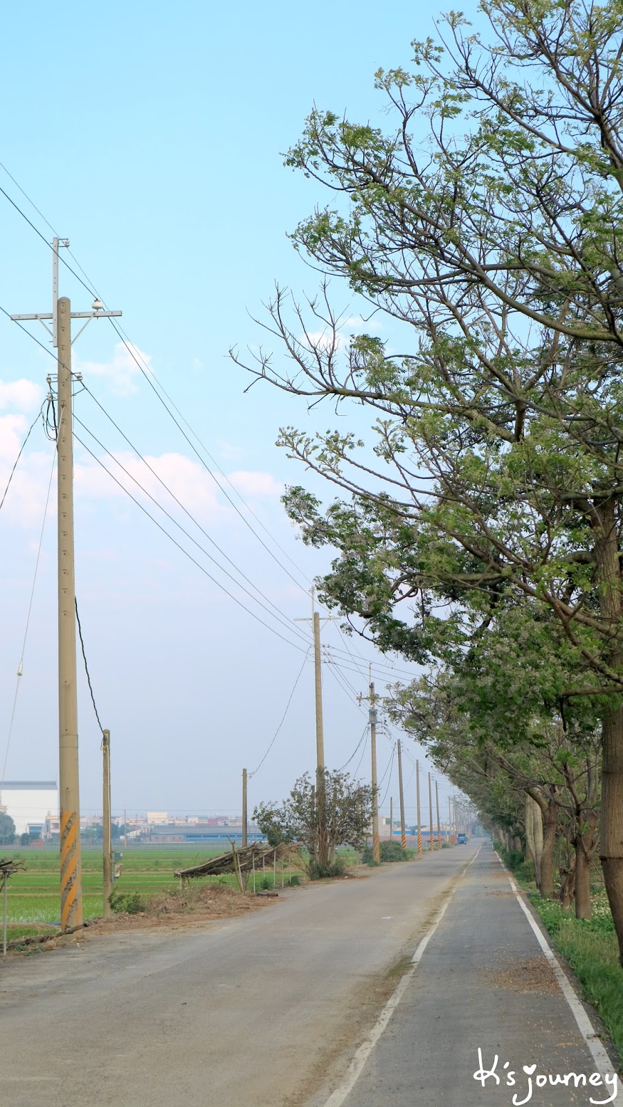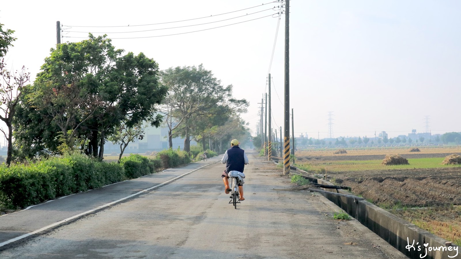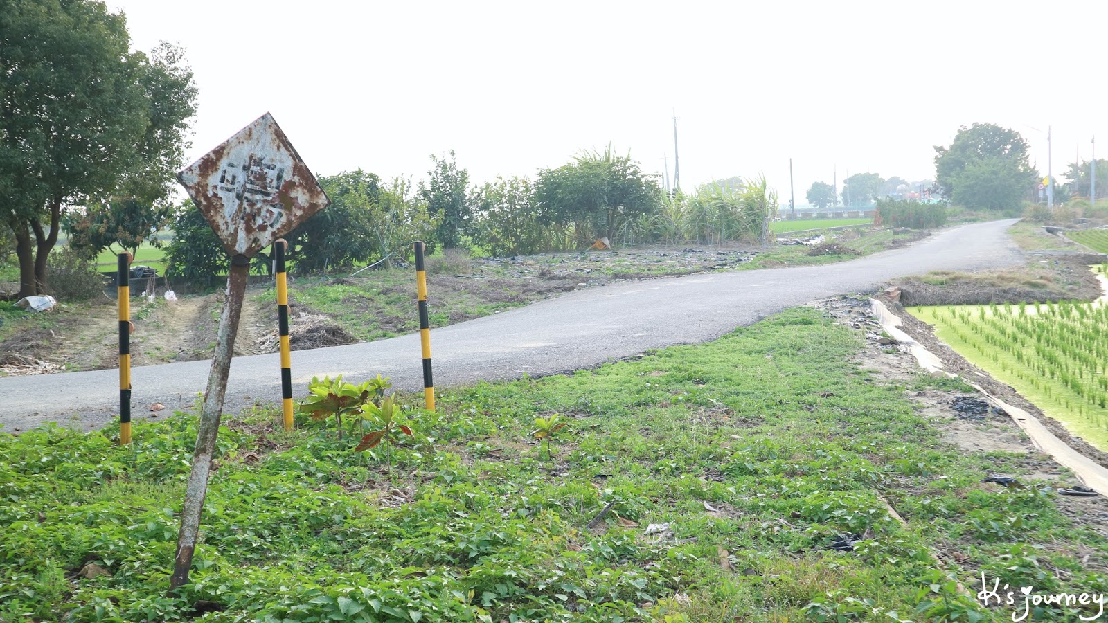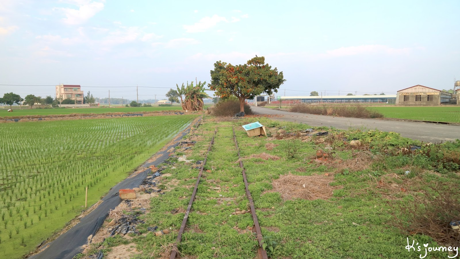過了溪民路,繼續直行。這條平常真的沒什麼人經過。如果在12月初來,可以在附近田地看到一整片的稻草堆。舊鐵道已重新鋪上柏油,完全看不出鐵軌在哪。