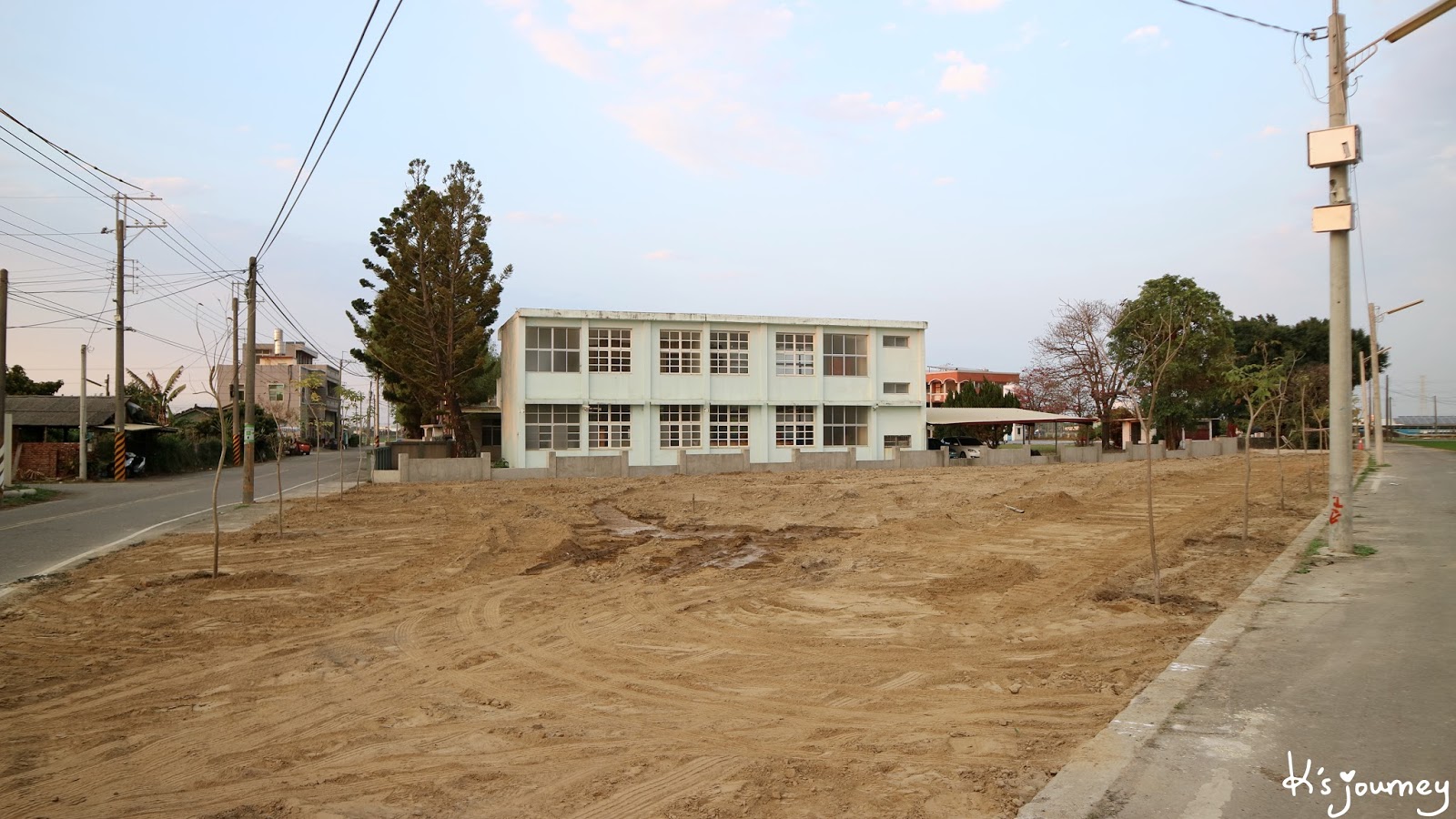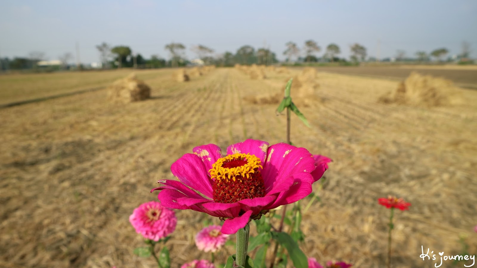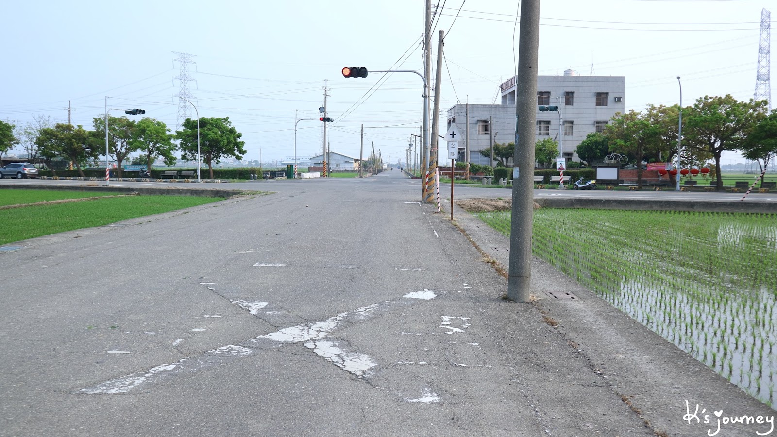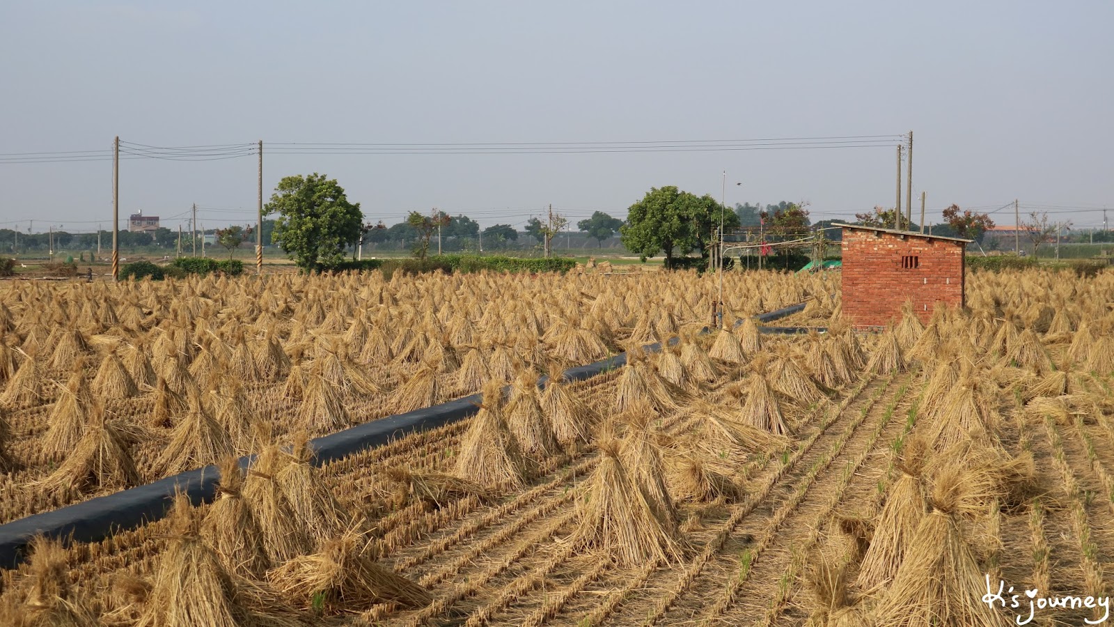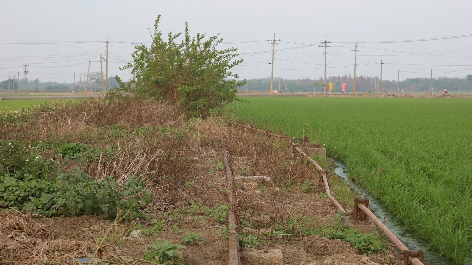 過了溪民路,繼續直行。這條平常真的沒什麼人經過。如果在12月初來,可以在附近田地看到一整片的稻草堆。舊鐵道已重新鋪上柏油,完全看不出鐵軌在哪。