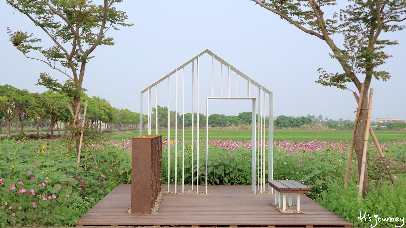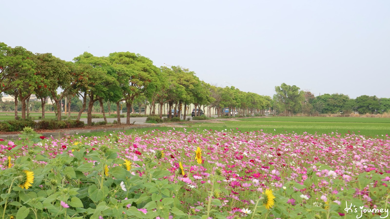 3月,一旁開滿波斯菊和向日葵。