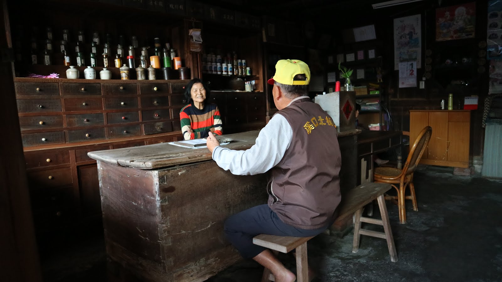 後來,一對帶著相機,手拿溪口門牌號碼清單,像在做文史資料調查的男女走進屋內,對眼前事物感到好奇,便問起中藥房的過去。從房子的一磚一瓦講到中藥材,劉阿嬤無藏私為大家解惑。