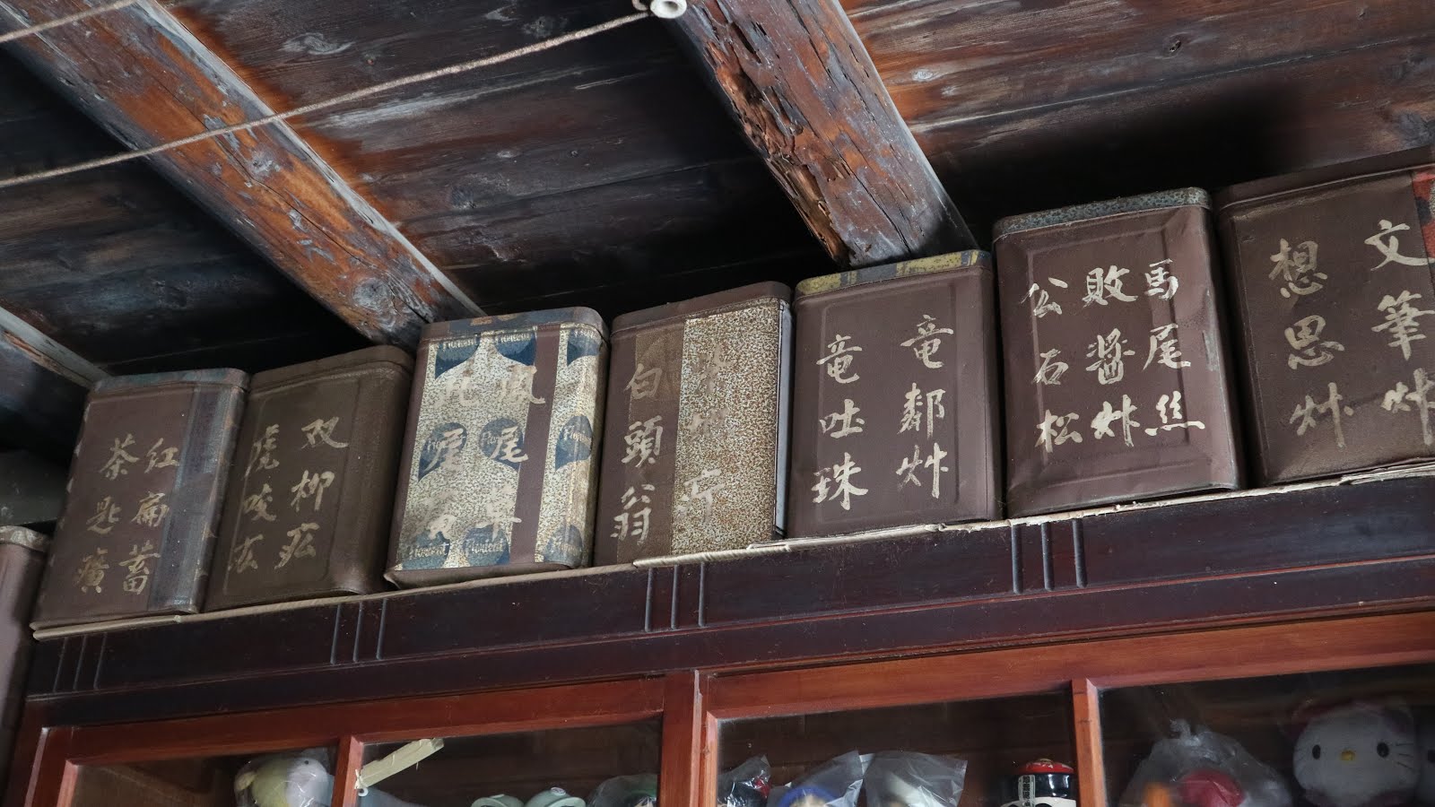 木造天花板留有置物空間可放藥材。黑色木頭是因為古時候都在屋內煎藥煙燻所致。特別的是房子建造之初所牽的電線還堪用,只不過不能接冷氣就是了,但這裡沒有裝冷氣的理由,相當通風!聊到一半,風從後門透進來,冷到劉阿嬤趕緊披上背心。