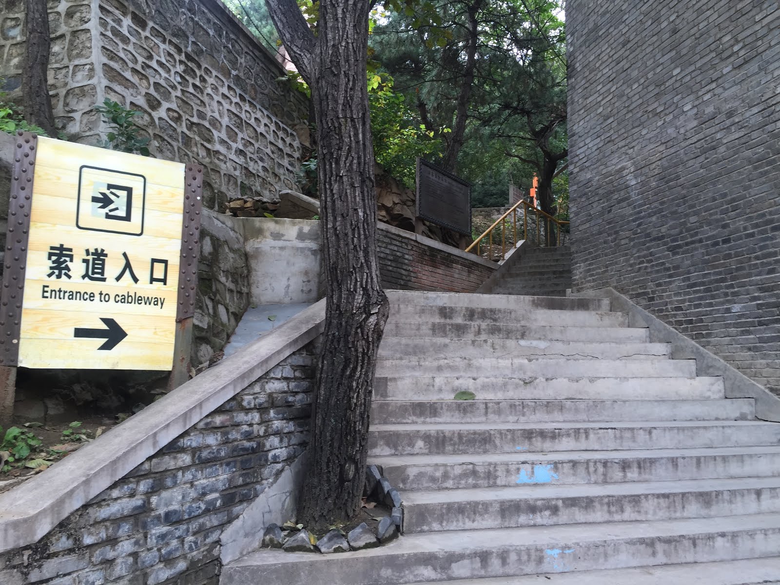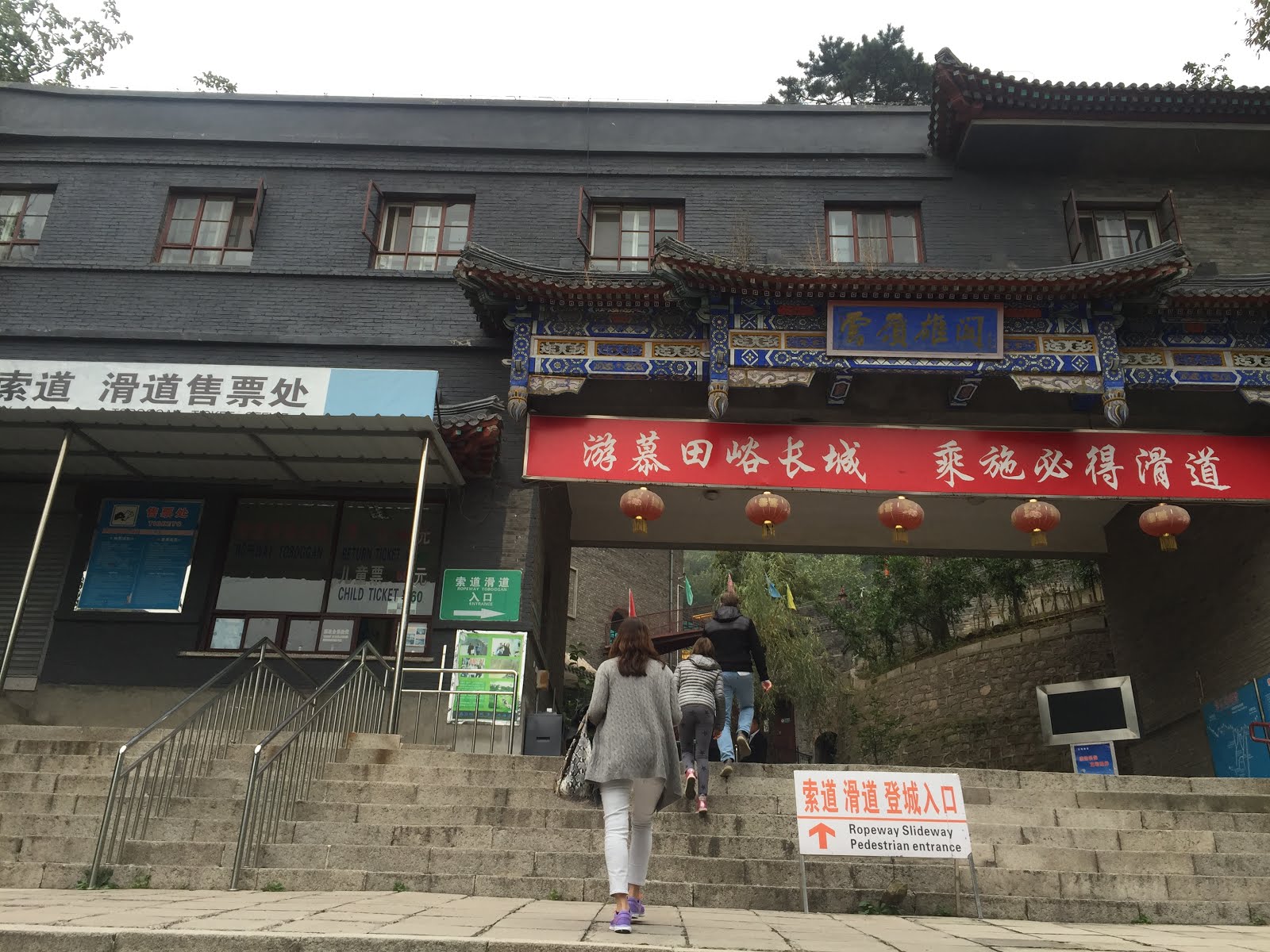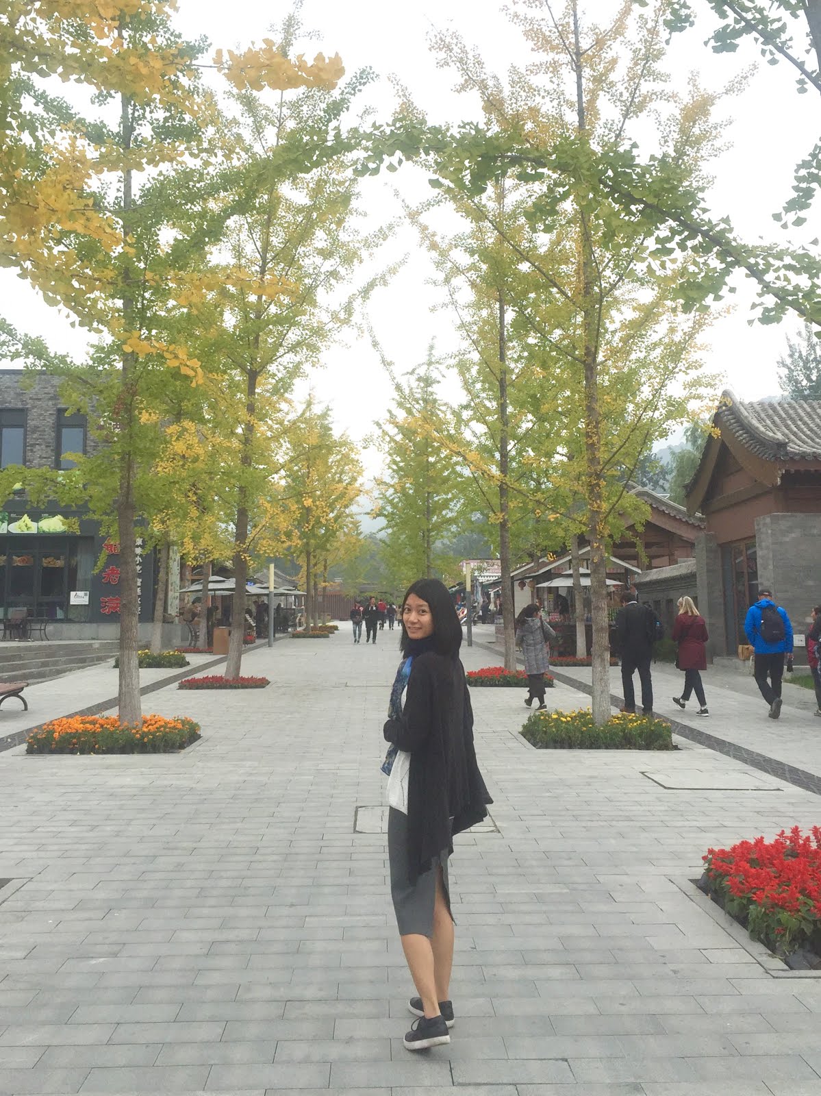 和旅伴說好,這次長城之旅屬於貴婦行程,搭索道上山,坐滑道下山。經實驗證明真的不累,而且人沒有很多可以拍很多美照~到售票口後買了套票共¥160。(長城門票¥45+索道滑道各¥100+擺渡車¥15)接著就是要去搭擺渡車(接駁車的意思),沿路有很多賣水、零食跟紀念品的小販,不過這邊賣很貴,還是自己帶比較好喔!還有漂亮的銀杏樹~好期待長城上面的美麗風景呀!